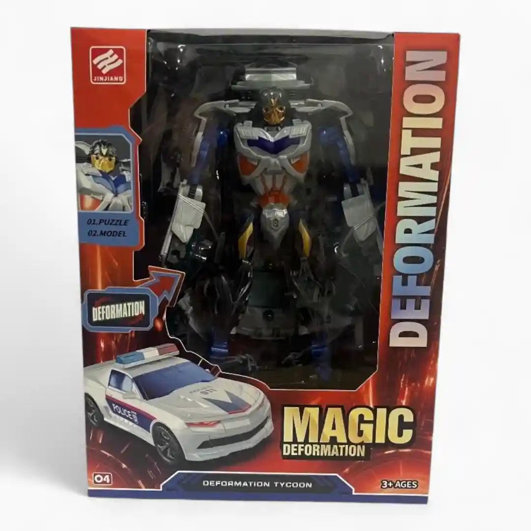 Lo que hace que este juguete sea tan especial es su habilidad de DEFORMATION o transformación mágica. El set incluye el modo vehículo, un coche de policía blanco con detalles azules que tiene el número ’04’ en el lateral. Al transformarse, se convierte en un impresionante robot de colores azul, negro y gris con acentos naranjas o rojos en el pecho, listo para la batalla.