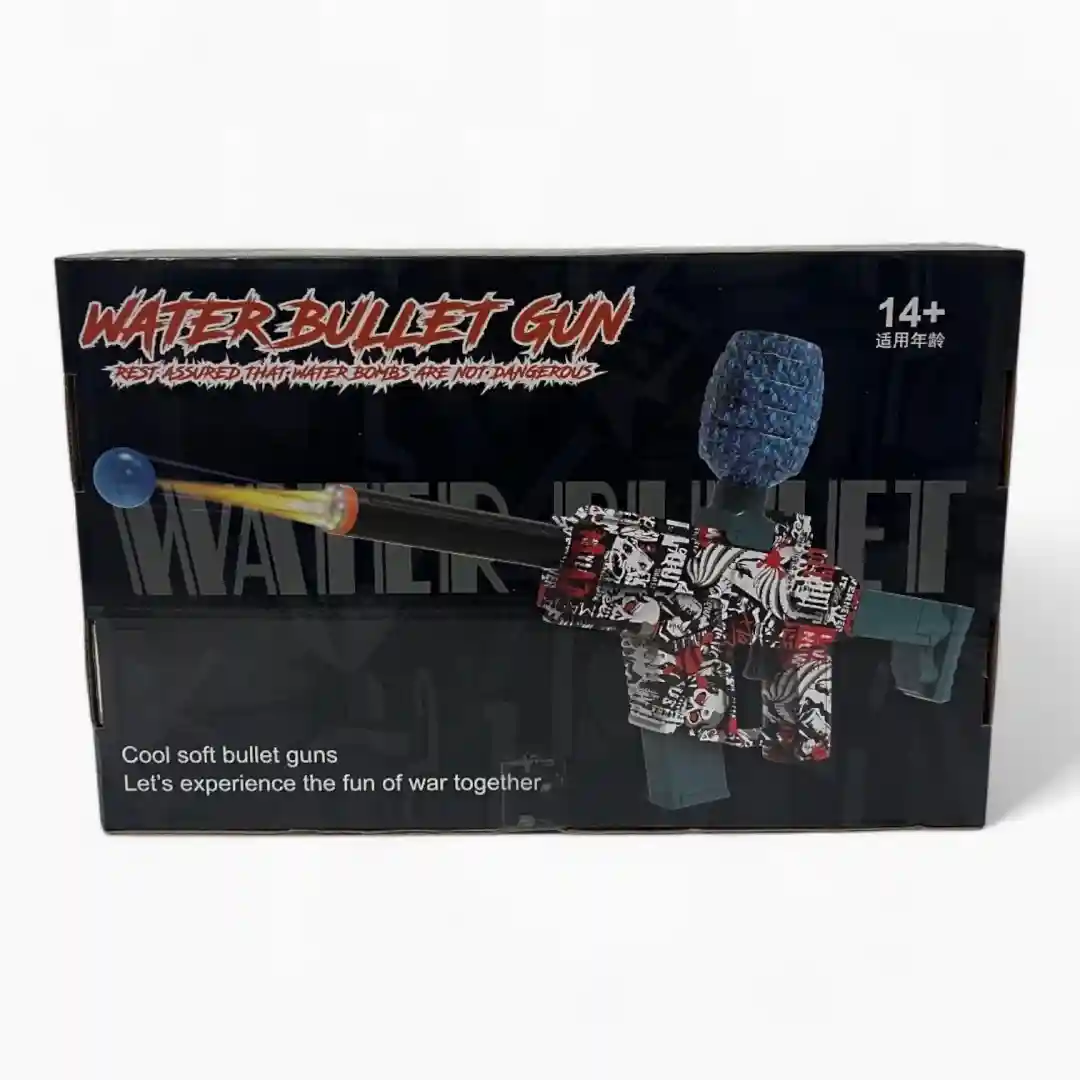 Diseño Táctico y Gráfico de Calaveras: La pistola posee un diseño de rifle de asalto moderno, con un cañón largo y un cargador superior para las municiones de hidrogel. Su aspecto es llamativo, con un patrón de grafiti de calaveras rojas y blancas que le da un toque distintivo y agresivo.