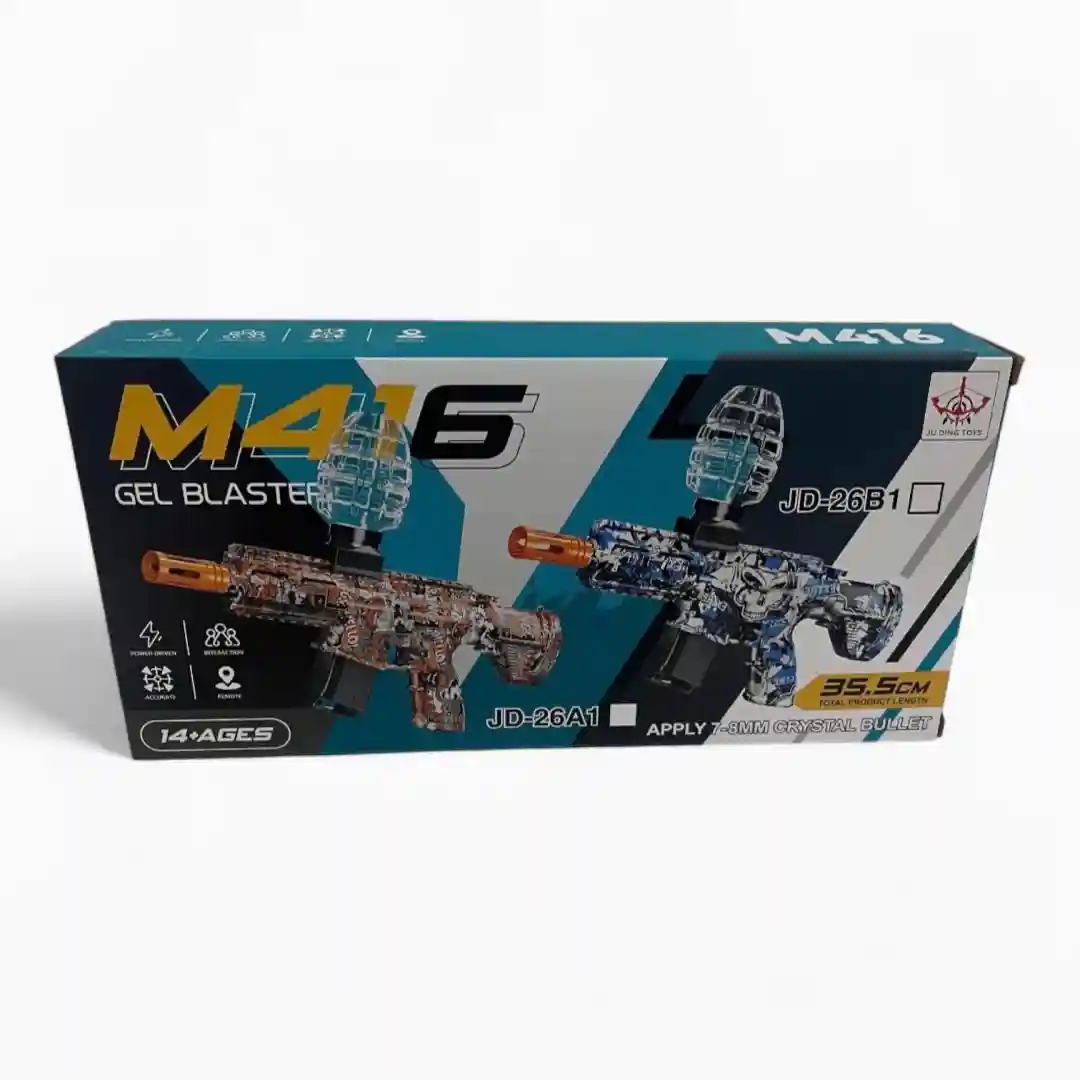 Este kit de la serie M416 Gel Blaster se destaca por ofrecer no uno, sino dos lanzadores de bolas de gel con un estilo moderno y atrevido. La caja muestra claramente la presencia de dos modelos distintos: el JD-26A1 y el JD-26B1, lo que garantiza una variedad de estilo.