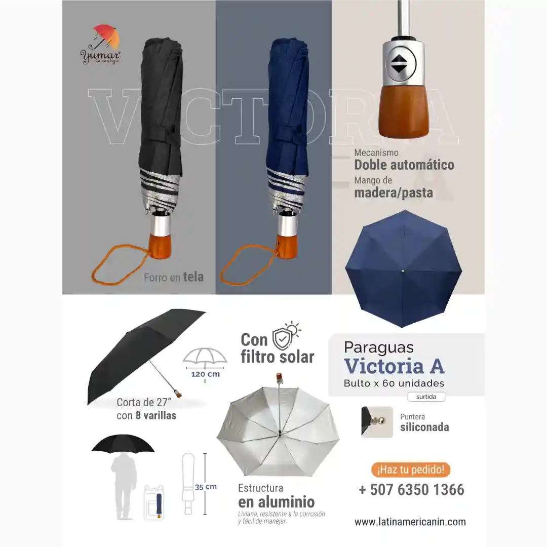 - Estructura: Fabricada íntegramente en aluminio, lo que garantiza un paraguas excepcionalmente liviano, resistente a la corrosión y fácil de manipular.