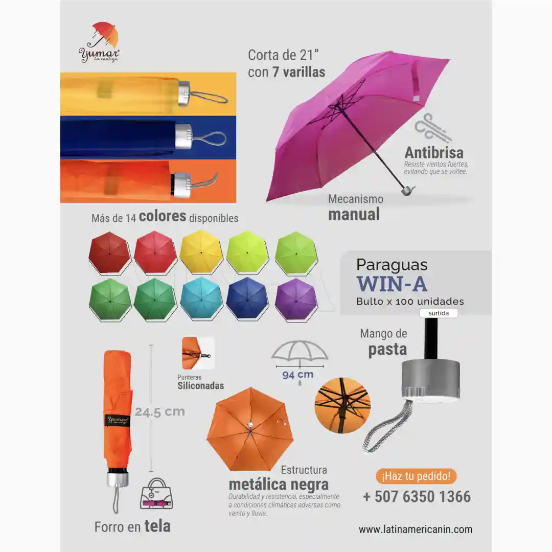 - Usos Ideales: El paraguas ideal para el consumidor que busca un producto robusto con resistencia al viento y, al mismo tiempo, una amplia variedad de colores para combinar con su estilo personal o vestimenta. Perfecto para el uso diario en climas inestables.