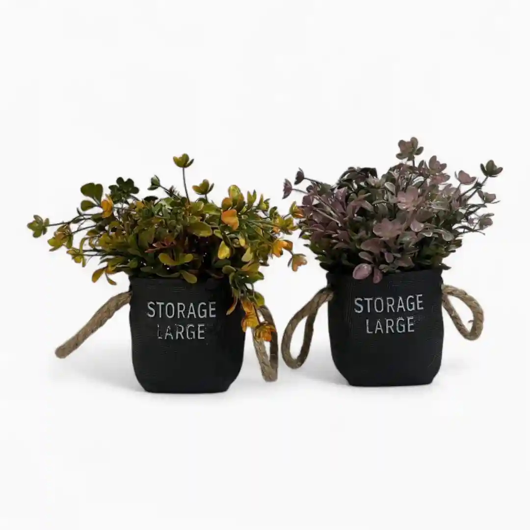 - El Contenedor Moderno: Las plantas vienen en una maceta de estilo saco o bolsa en un color negro mate muy elegante. Este diseño le da un aire industrial o nórdico muy actual. Además, lleva impresa la frase ‘STORAGE LARGE’ en letras claras, que aunque no sea un contenedor real de almacenamiento, ¡le da ese aire funcional y de tendencia que tanto se lleva!