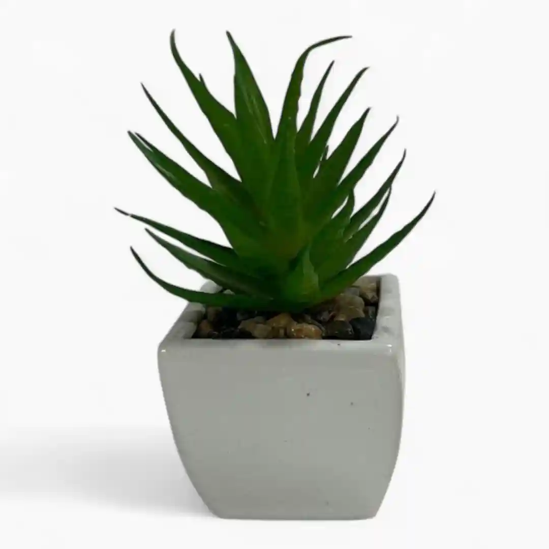 Su diseño minimalista y moderno. La planta artificial simula ser una suculenta tipo áloe o agave en miniatura, con hojas carnosas de un color verde vibrante que luce increíblemente real. Lo mejor de todo es la atención al detalle en la base, que simula tener tierra y pequeñas piedritas en tonos naturales, dándole un acabado muy auténtico y de alta calidad.