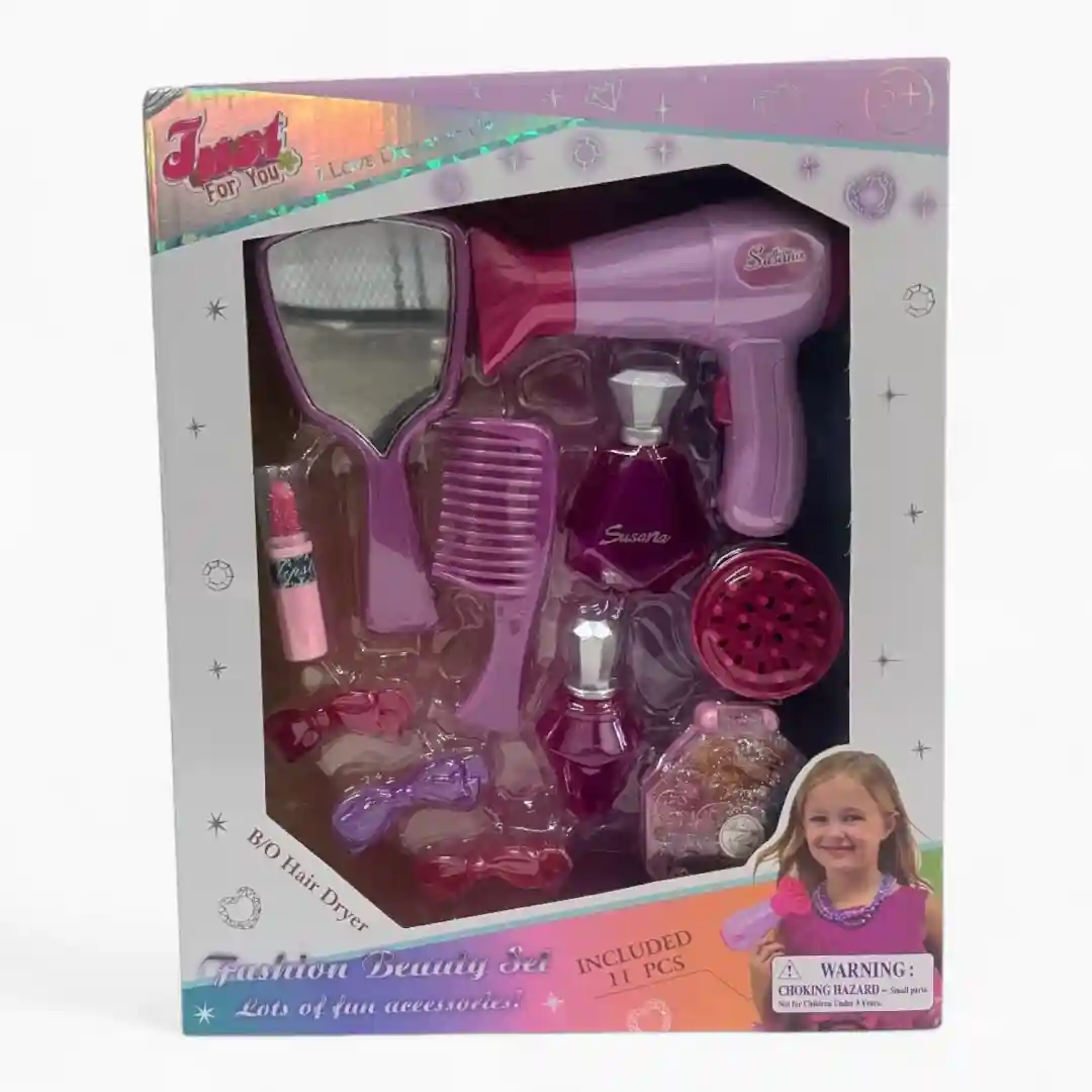 - Secador de Pelo (B/O Hair Dryer): Un secador de juguete de color lila y rosa que funciona a pilas (Battery Operated), lo que añade un realismo interactivo al juego.