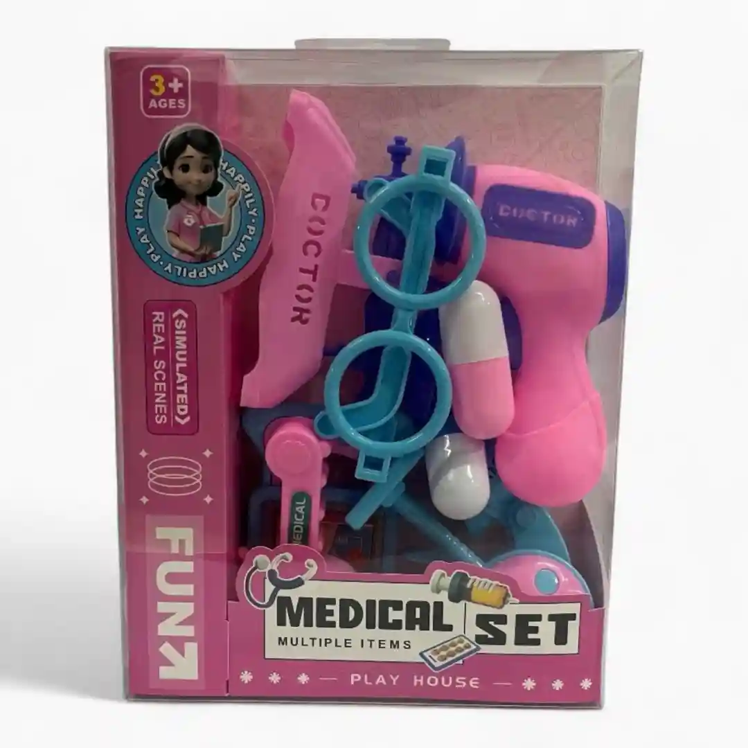 • Accesorios Esenciales Incluidos: El set contiene varios elementos típicos de un kit médico, incluyendo un juguete que simula un martillo de reflejos, unas gafas de doctor de color azul claro, un par de píldoras grandes, una jeringa, y otros utensilios de color rosa, como un accesorio con la palabra DOCTOR.