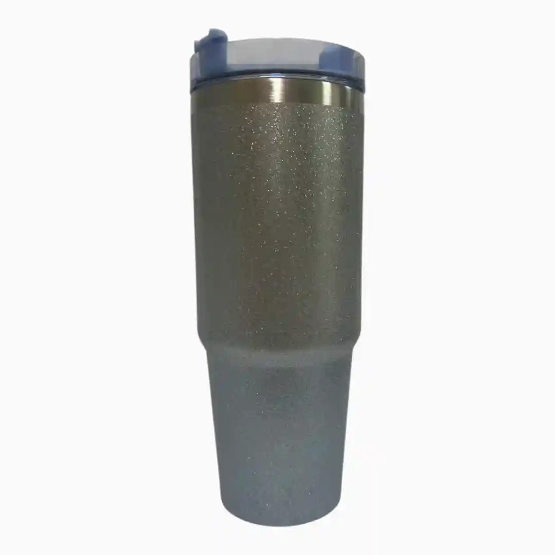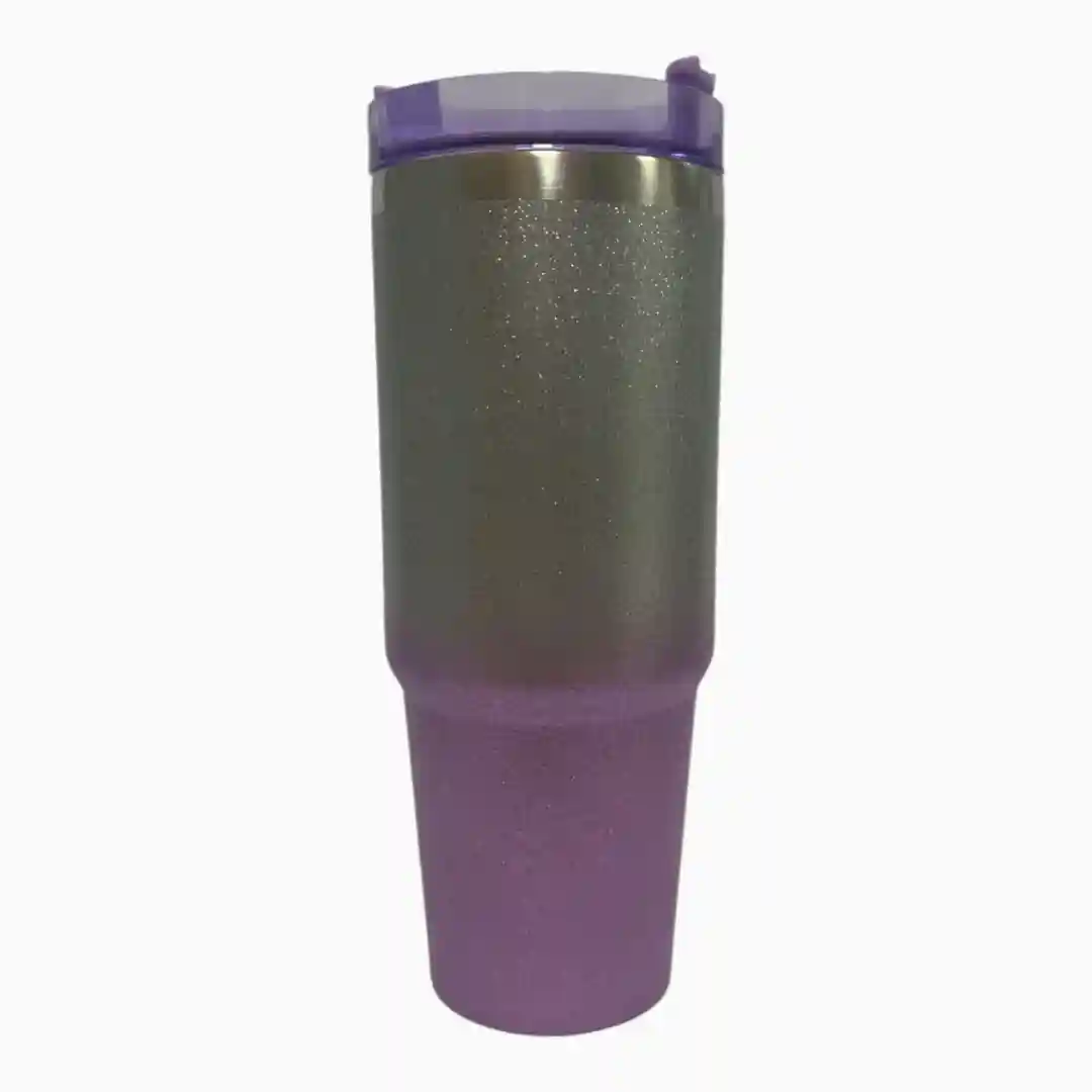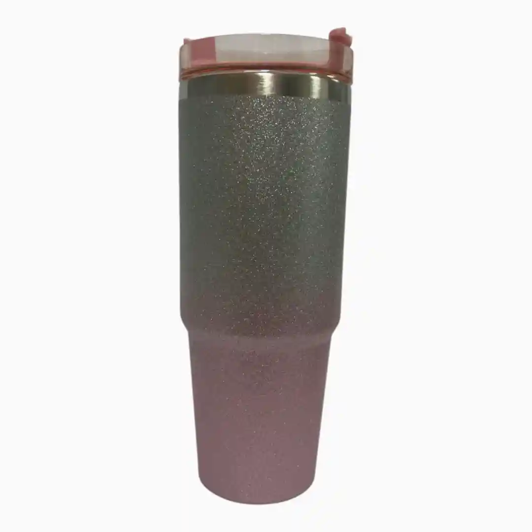 Vaso térmico de acero inoxidable con un llamativo diseño de degradado y acabado brillante de purpurina. Su aislamiento de doble pared lo hace ideal para mantener la temperatura de las bebidas. Su diseño sin asa lo convierte en un accesorio elegante y funcional para el día a día.