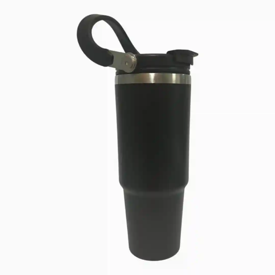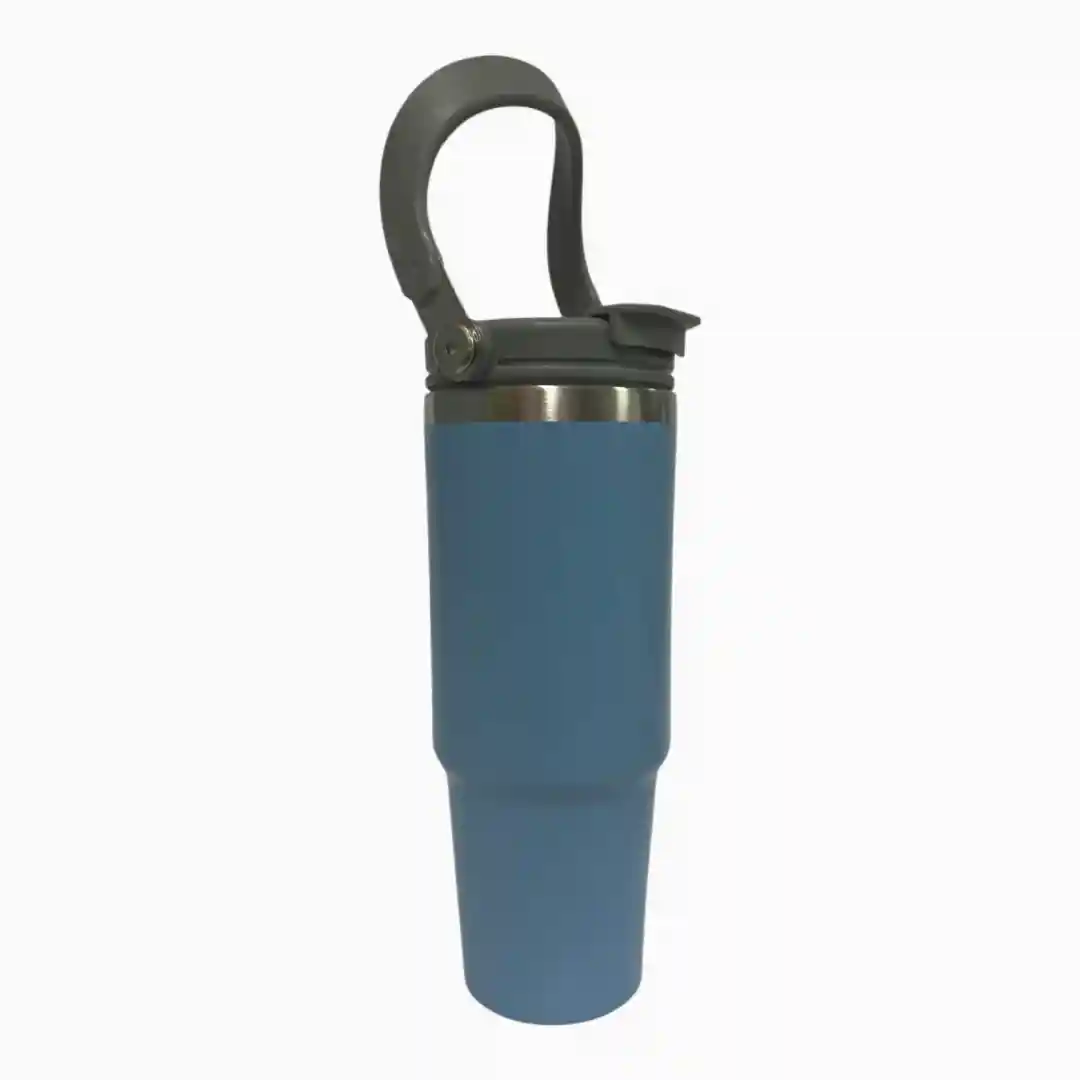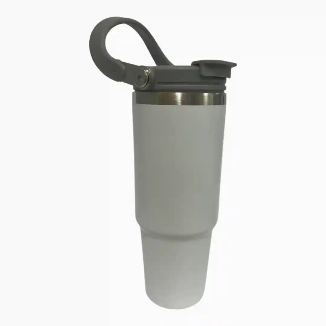Vaso térmico de acero inoxidable con un diseño moderno y minimalista, equipado con un innovador asa giratoria de plástico. Su aislamiento de doble pared lo convierte en el compañero perfecto para mantener las bebidas a la temperatura ideal, ya sea en la oficina, el gimnasio o al aire libre.