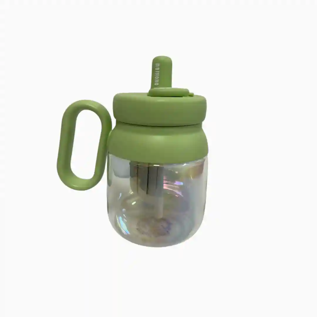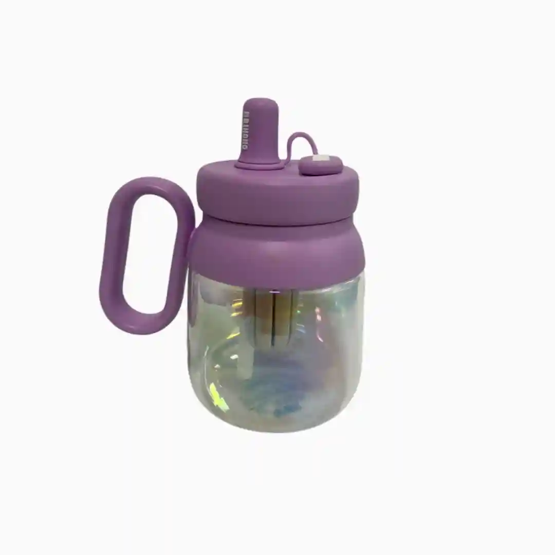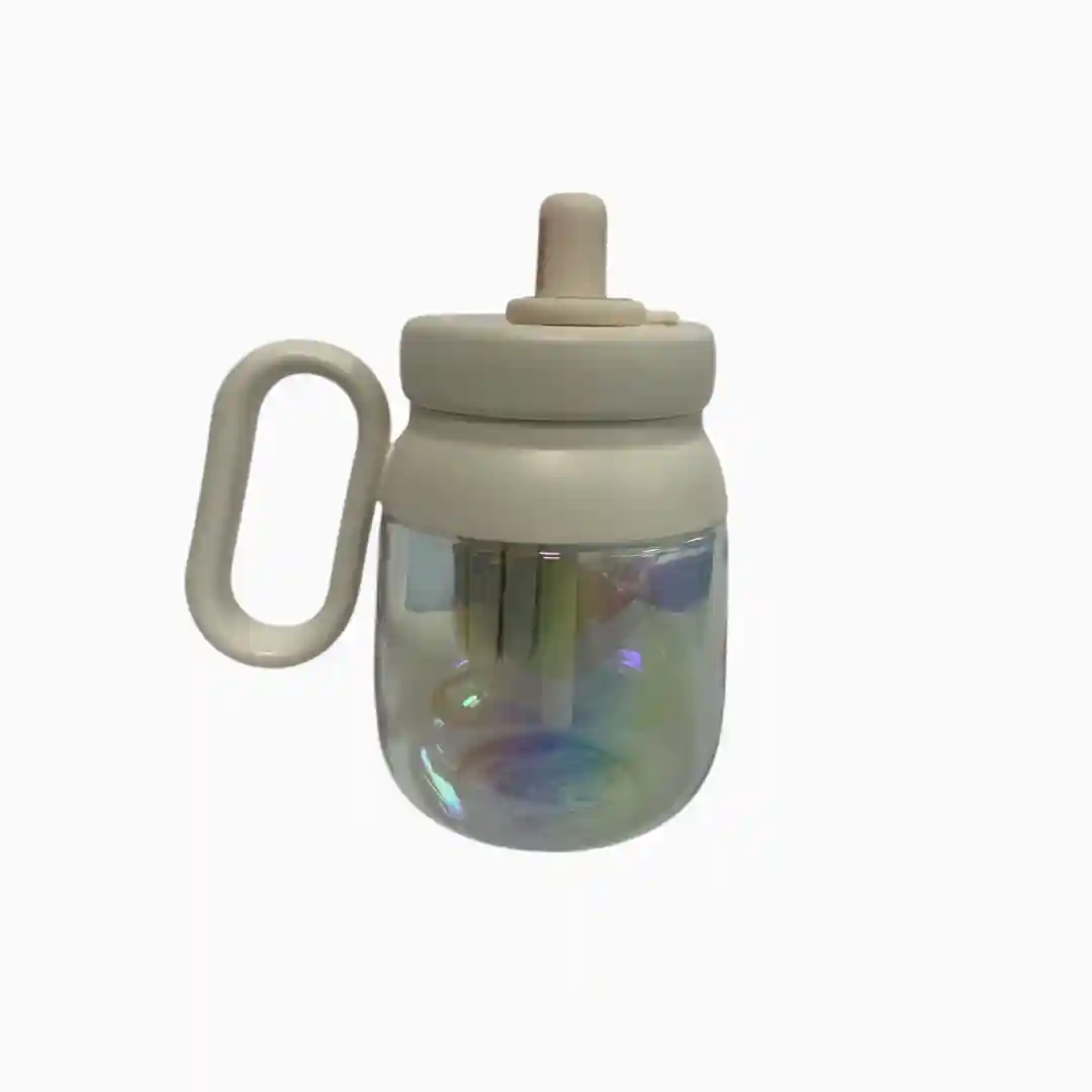 Vaso infantil con diseño ergonómico y atractivo acabado tornasolado en el cuerpo. Incluye tapa hermética con pitillo abatible y asa lateral de fácil agarre, ideal para niños pequeños. Fabricado en materiales resistentes y seguros para uso diario.
