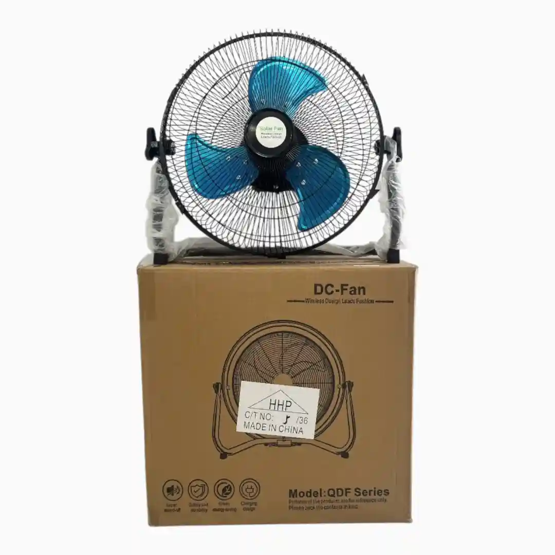 Pero lo que realmente destaca es su tecnología. Es un DC-Fan (Ventilador de Corriente Directa), lo que generalmente significa que es recargable y tiene un alto rendimiento con bajo consumo. Y si miran bien el centro del motor, tiene un logo que claramente dice Solar Fan (Ventilador Solar). ¡Esto sugiere fuertemente que este ventilador está diseñado para ser cargado, o incluso impulsado, por energía solar! Energía verde, ahorro en su factura y frescura garantizada.